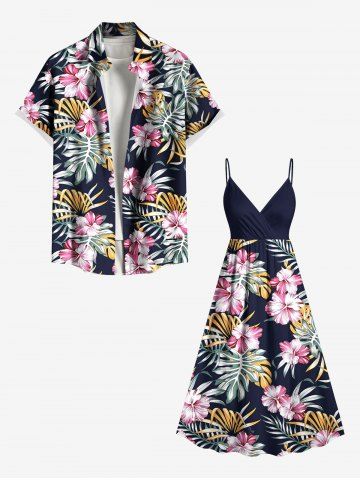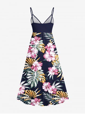 Plus Size Tropical Leaf Hibiscus Flower Print Hawaii Surplice A Line Cami Dress - Deep Blue - S