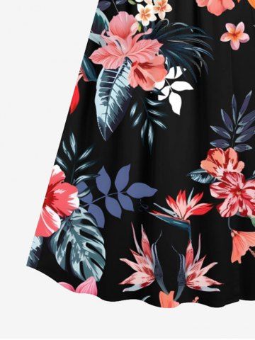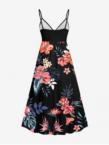 Plus Size Tropical Leaf Hibiscus Flower Print Hawaii Surplice A Line Cami Dress - Black - 2x