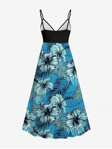 Plus Size Tropical Leaf Hibiscus Flower Print Hawaii Surplice A Line Cami Dress - Blue - 1x