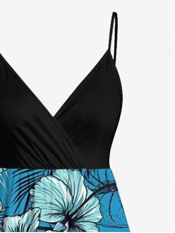 Plus Size Tropical Leaf Hibiscus Flower Print Hawaii Surplice A Line Cami Dress - Blue - 3x
