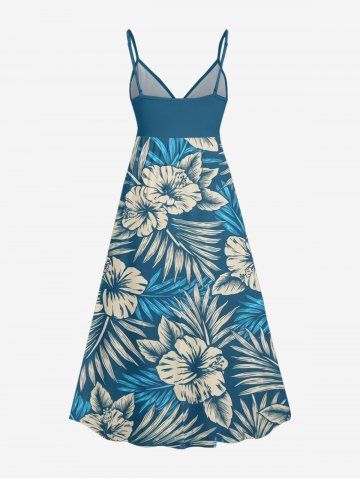 Plus Size Tropical Leaf Hibiscus Flower Print Hawaii Surplice A Line Cami Dress - Peacock Blue - Xs