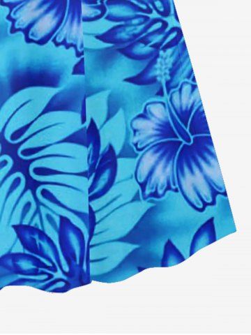 Plus Size Tropical Leaf Hibiscus Flower Print Hawaii Surplice A Line Dress - Blue - L