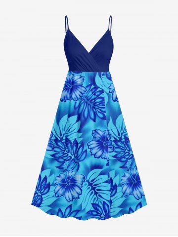 Plus Size Tropical Leaf Hibiscus Flower Print Hawaii Surplice A Line Dress - Blue - 1x