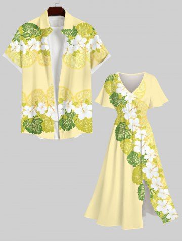 Plus Size Tropical Leaf Hibiscus Flower Print Split Hawaii Midi Dress - Yellow - 1x