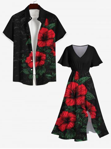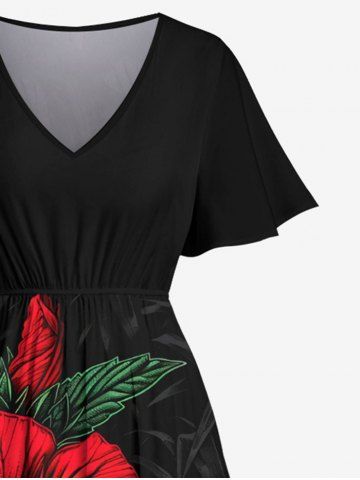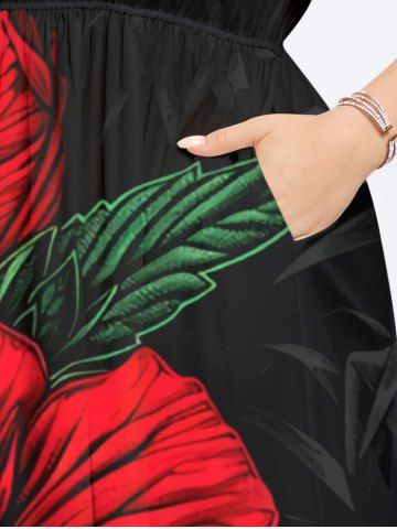 Plus Size Tropical Leaf Hibiscus Flower Print Split Hawaii Midi Dress - Black - L