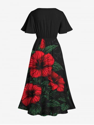 Graphic Dresses > Plus Size Tropical Leaf Hibiscus Flower Print Split Hawaii Midi Dress