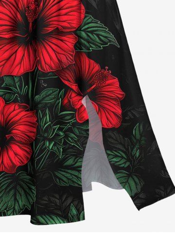 Plus Size Tropical Leaf Hibiscus Flower Print Split Hawaii Midi Dress - Black - 4x