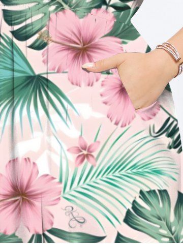 Plus Size Tropical Leaf Hibiscus Flower Print Split Hawaii Midi Dress - Multi-a - 5x