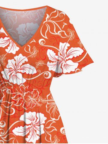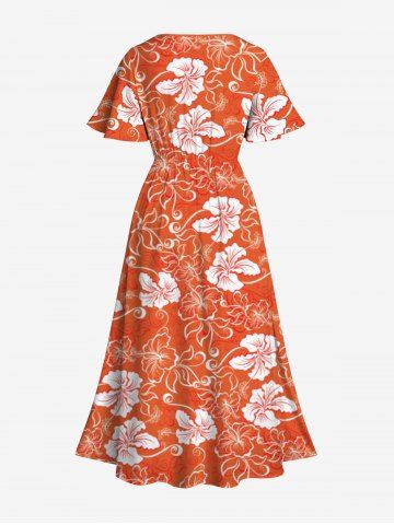 Plus Size Tropical Leaf Hibiscus Flower Print Split Hawaii Midi Dress - Orange - 1x