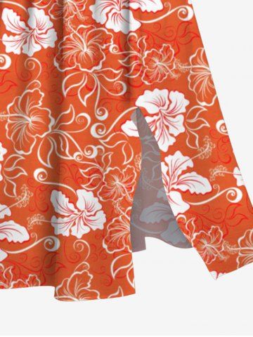 Plus Size Tropical Leaf Hibiscus Flower Print Split Hawaii Midi Dress - Orange - 5x