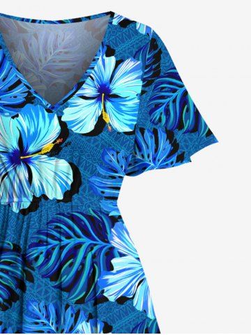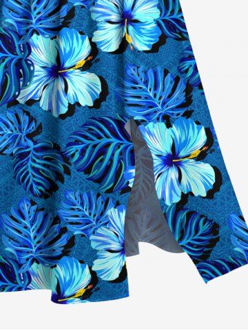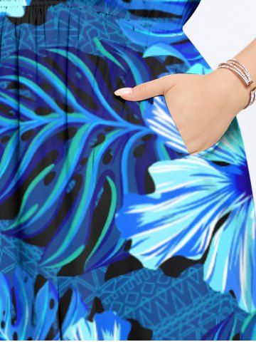 Plus Size Tropical Leaf Hibiscus Flower Print Split Hawaii Midi Dress - Sky Blue - 2x