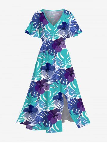 Plus Size Tropical Leaf Hibiscus Flower Print Split Hawaii Midi Dress - Blue - 5x