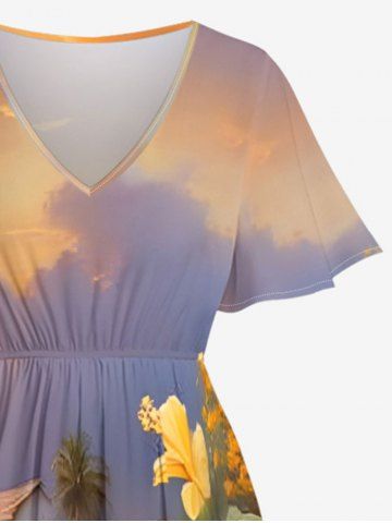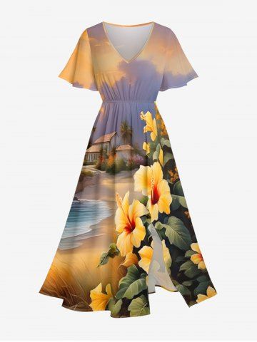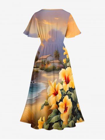 Plus Size Tropical Leaf Hibiscus Flower Sea Beach House Print Hawaii Split Pocket A Line Midi Dress - Golden Brown - 5x