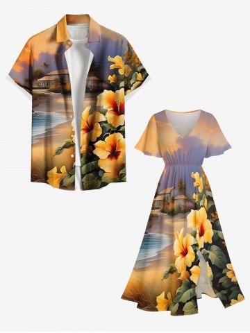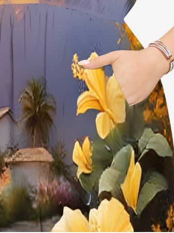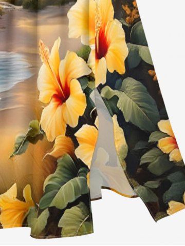 Graphic Dresses > Plus Size Tropical Leaf Hibiscus Flower Sea Beach House Print Hawaii Split Pocket A Line Midi Dress