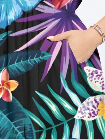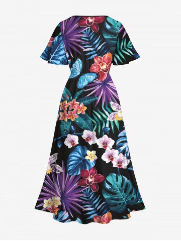 Plus Size Tropical Leaf Hibiscus Flowers Butterfly Print Split Hawaii Midi Dress - Black - 2x