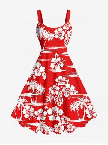 Plus Size Tropical Leaf Hibiscus Flowers Coconut Tree Print Hawaii Tank Dress - Red - 3x