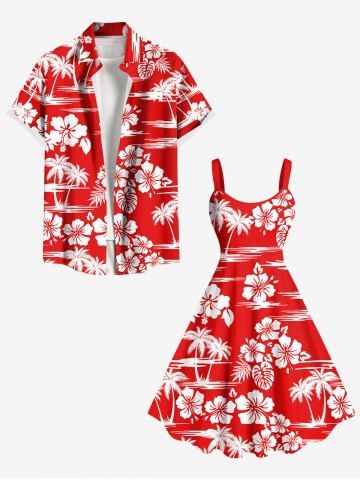 Plus Size Tropical Leaf Hibiscus Flowers Coconut Tree Print Hawaii Tank Dress - Red - 4x