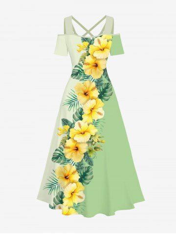 Plus Size Tropical Leaf Hibiscus Flowers Colorblock Print Cold Shoulder Crisscross Hawaii Maxi Dress - Green - L