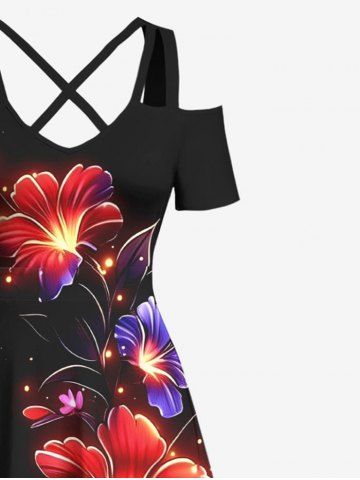 Plus Size Tropical Leaf Hibiscus Flowers Glitter 3D Print Cold Shoulder Crisscross Maxi Dress - Black - S