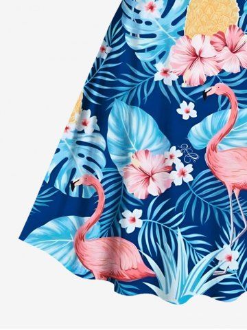 Plus Size Tropical Leaf Hibiscus Flowers Pineapple Print Vintage Hawaii Dress - Blue - S