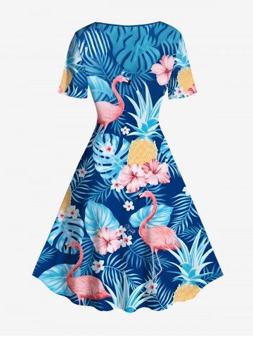Plus Size Tropical Leaf Hibiscus Flowers Pineapple Print Vintage Hawaii Dress - Blue - 6x