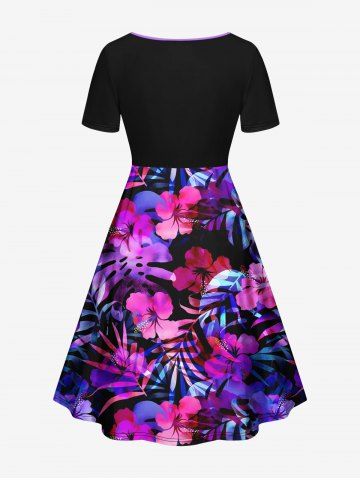 Plus Size Tropical Leaf Hibiscus Flowers Print Cinched Hawaii Dress - Black - 2x