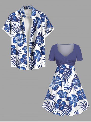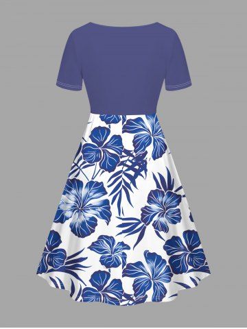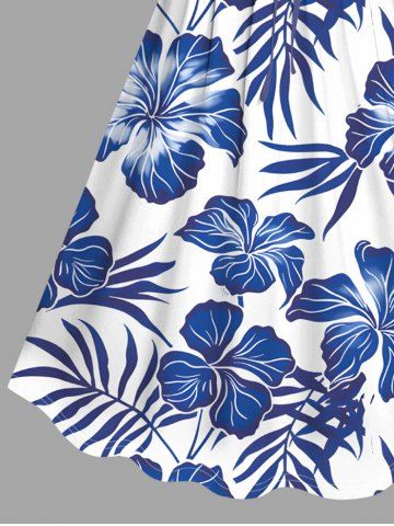 Plus Size Tropical Leaf Hibiscus Flowers Print Cinched Hawaii Dress - Blue - 1x