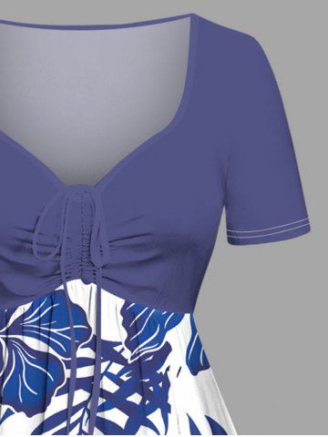 Plus Size Tropical Leaf Hibiscus Flowers Print Cinched Hawaii Dress - Blue - 3x