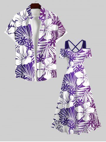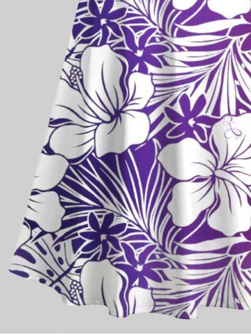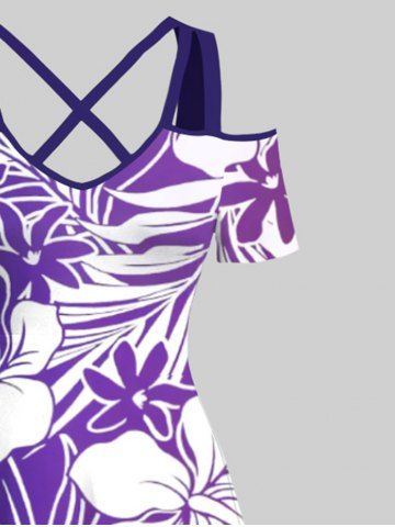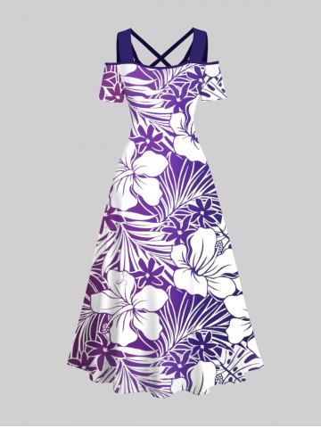 Plus Size Tropical Leaf Hibiscus Flowers Print Cold Shoulder Crisscross Hawaii Maxi Dress - Purple - 5x