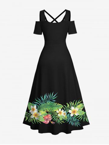 Plus Size Tropical Leaf Hibiscus Flowers Print Cold Shoulder Crisscross Hawaii Maxi Dress - Black - S