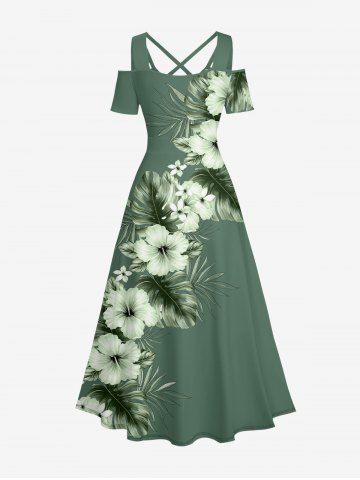 Plus Size Tropical Leaf Hibiscus Flowers Print Cold Shoulder Crisscross Hawaii Maxi Dress - Green - Xxs