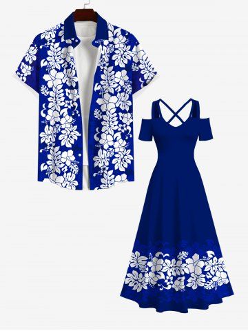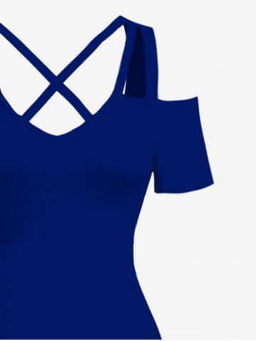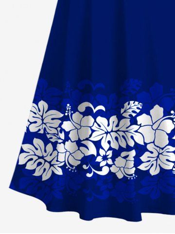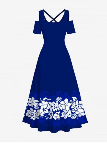 Plus Size Tropical Leaf Hibiscus Flowers Print Crisscross Cold Shoulder Hawaii Maxi Dress - Deep Blue - 5x