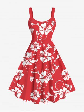 Plus Size Tropical Leaf Hibiscus Flowers Print Hawaii Tank Dress - Red - 1x