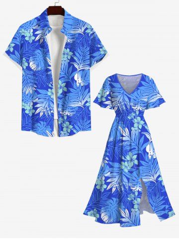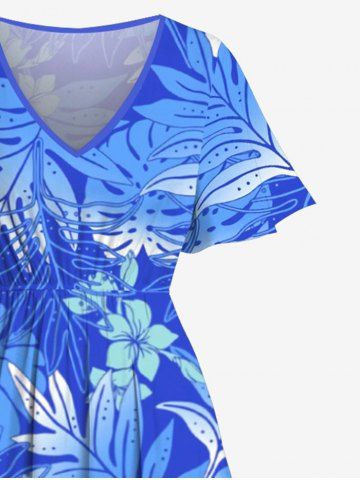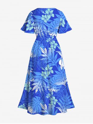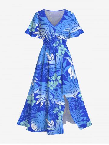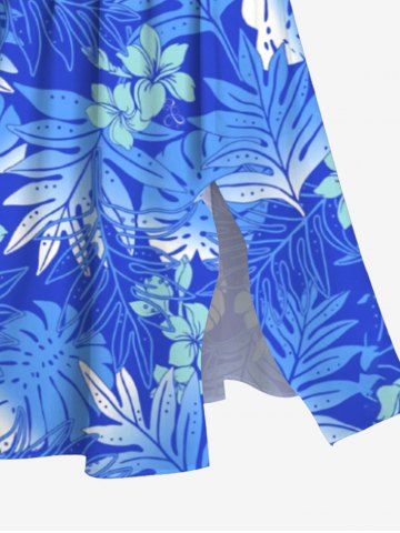 Plus Size Tropical Leaf Hibiscus Flowers Print Split Hawaii Midi Dress - Sky Blue - L