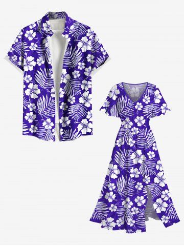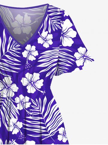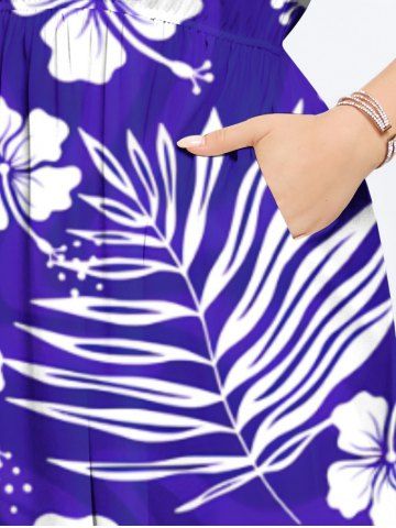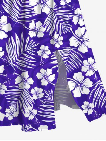 Plus Size Tropical Leaf Hibiscus Flowers Print Split Hawaii Midi Dress - Purple - L