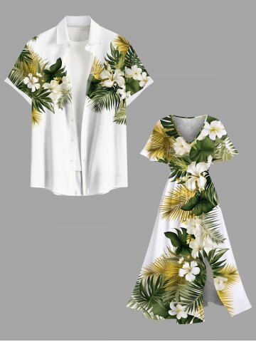 Plus Size Tropical Leaf Hibiscus Flowers Print Split Hawaii Midi Dress - Green - S
