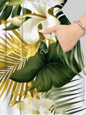 Plus Size Tropical Leaf Hibiscus Flowers Print Split Hawaii Midi Dress - Green - 2x