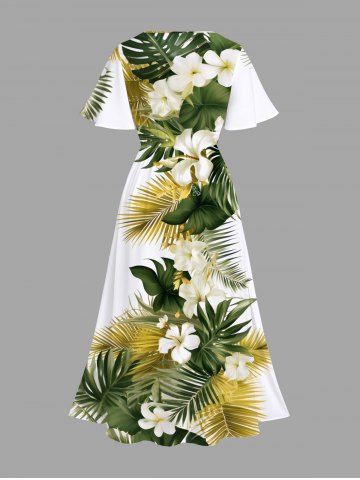Plus Size Tropical Leaf Hibiscus Flowers Print Split Hawaii Midi Dress - Green - 5x