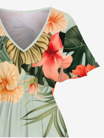 Plus Size Tropical Leaf Hibiscus Flowers Print Split Hawaii Midi Dress - Green - 6x