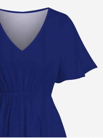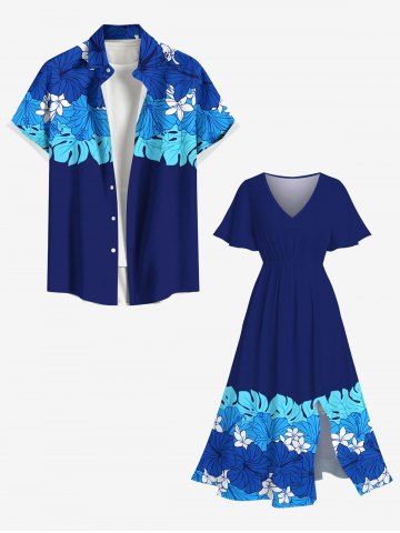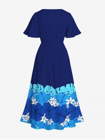 Plus Size Tropical Leaf Hibiscus Flowers Print Split Hawaii Midi Dress - Blue - Xxs