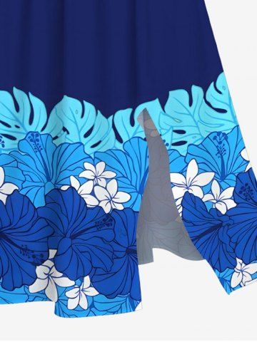 Plus Size Tropical Leaf Hibiscus Flowers Print Split Hawaii Midi Dress - Blue - Xs