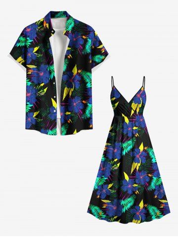 Plus Size Tropical Leaf Hibiscus Flowers Print Surplice Hawaii Cami Dress - Black - Xs