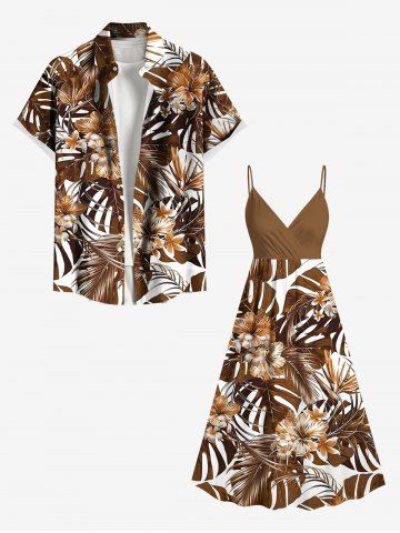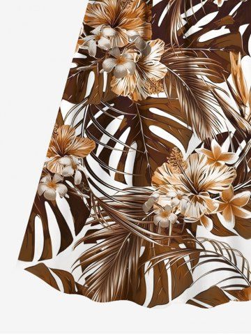 Plus Size Tropical Leaf Hibiscus Flowers Print Surplice Hawaii Cami Dress - Coffee - 3x