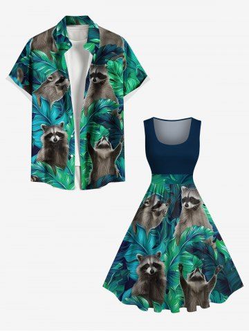 Graphic Dresses > Plus Size Tropical Leaf Little Raccoon Print Hawaii 1950s Vintage Dress