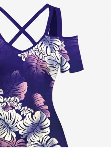 Plus Size Tropical Leaf Ombre Print Cold Shoulder Crisscross Hawaii Maxi Dress - Purple - 5x