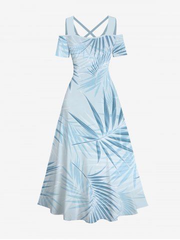Plus Size Tropical Leaf Print Cold Shoulder Crisscross Hawaii Maxi Dress - Light Blue - Xs