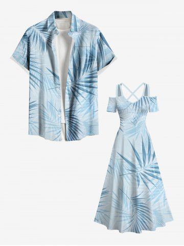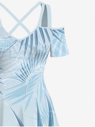 Plus Size Tropical Leaf Print Cold Shoulder Crisscross Hawaii Maxi Dress - Light Blue - M