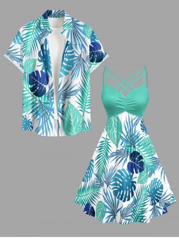 Plus Size Tropical Leaf Print Ruched Lattice Crisscross Straps Hawaii Dress - Turquoise - Xxs