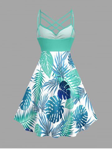 Plus Size Tropical Leaf Print Ruched Lattice Crisscross Straps Hawaii Dress - Turquoise - L