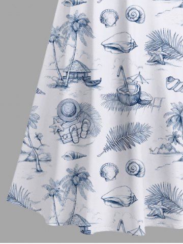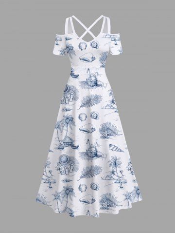 Plus Size Tropical Leaf Starfish Conch Coconut Tree Hand Paint Print Cold Shoulder Crisscross Hawaii Maxi Dress - White - 3x